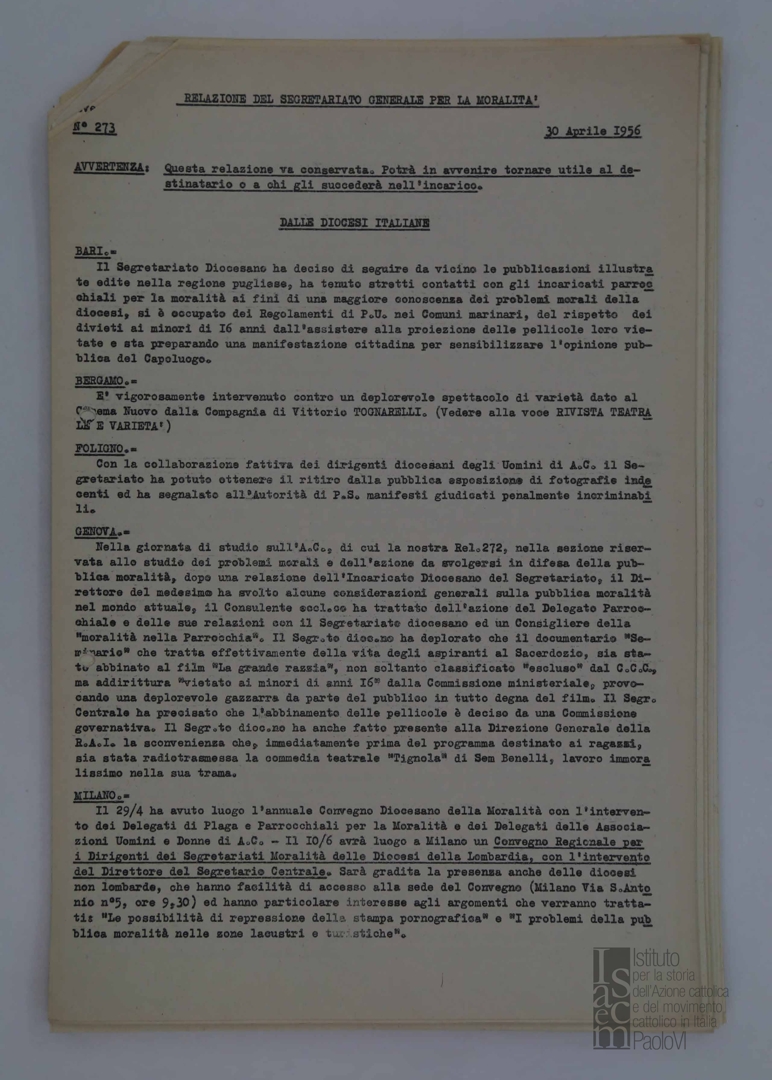 "Relazione del Segretariato Generale per la Moralità. Nr. 273"