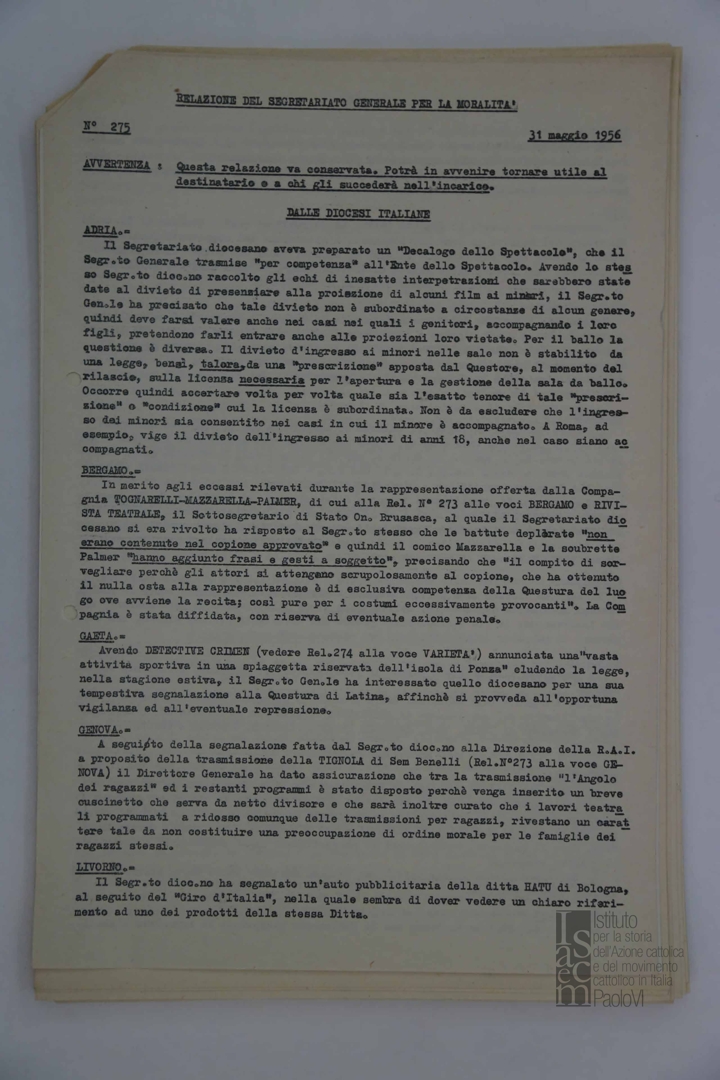 "Relazione del Segretariato Generale per la Moralità. Nr. 275"