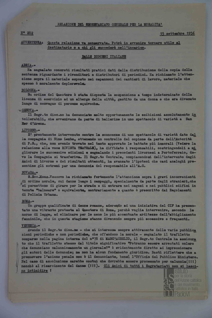 "Relazione del Segretariato Generale per la Moralità. Nr. 282"