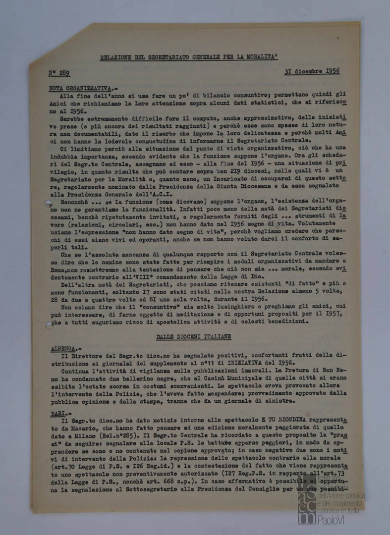 "Relazione del Segretariato Generale per la Moralità. Nr. 289"