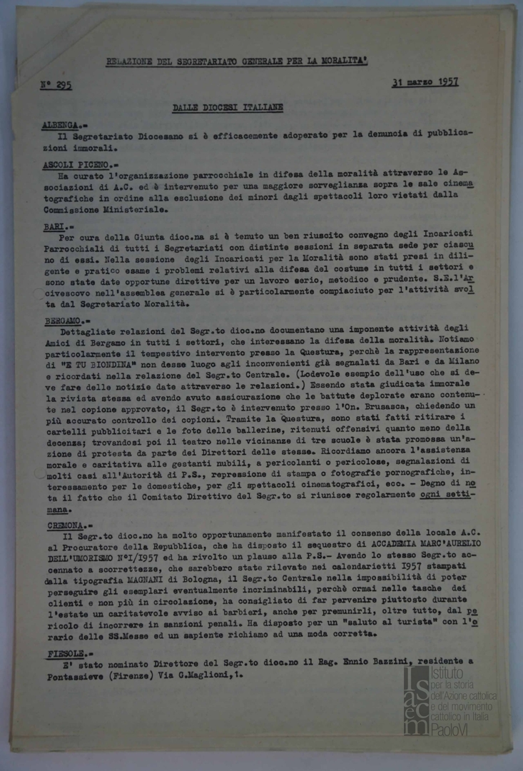 "Relazione del Segretariato Generale per la Moralità. Nr. 295"