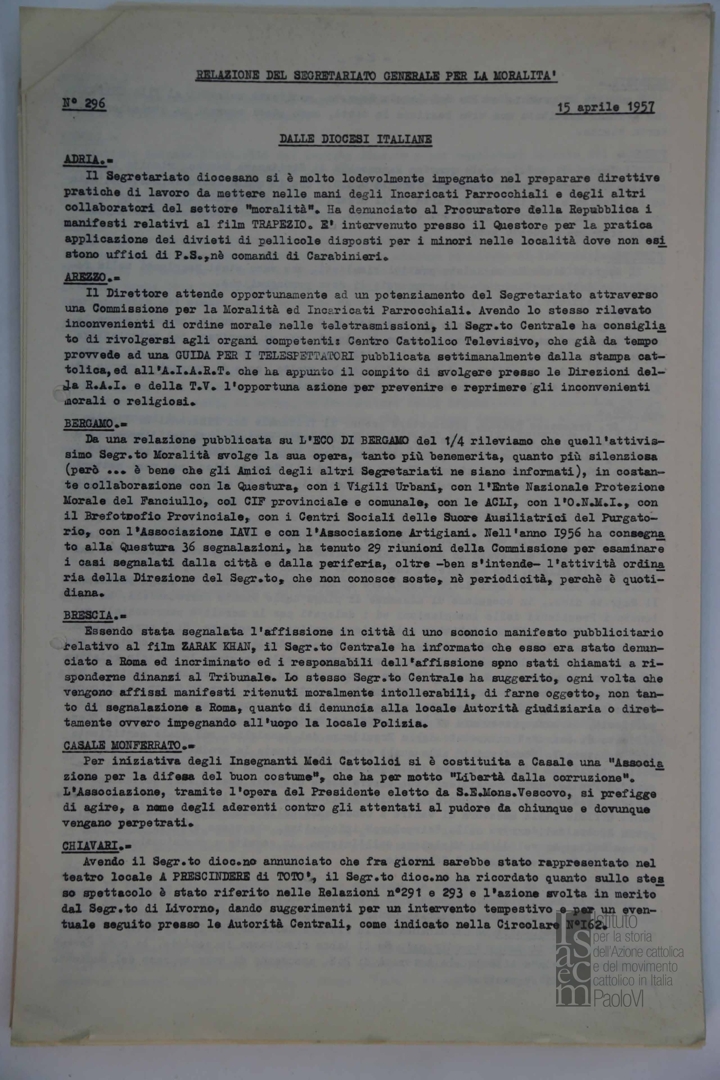 "Relazione del Segretariato Generale per la Moralità. Nr. 296"