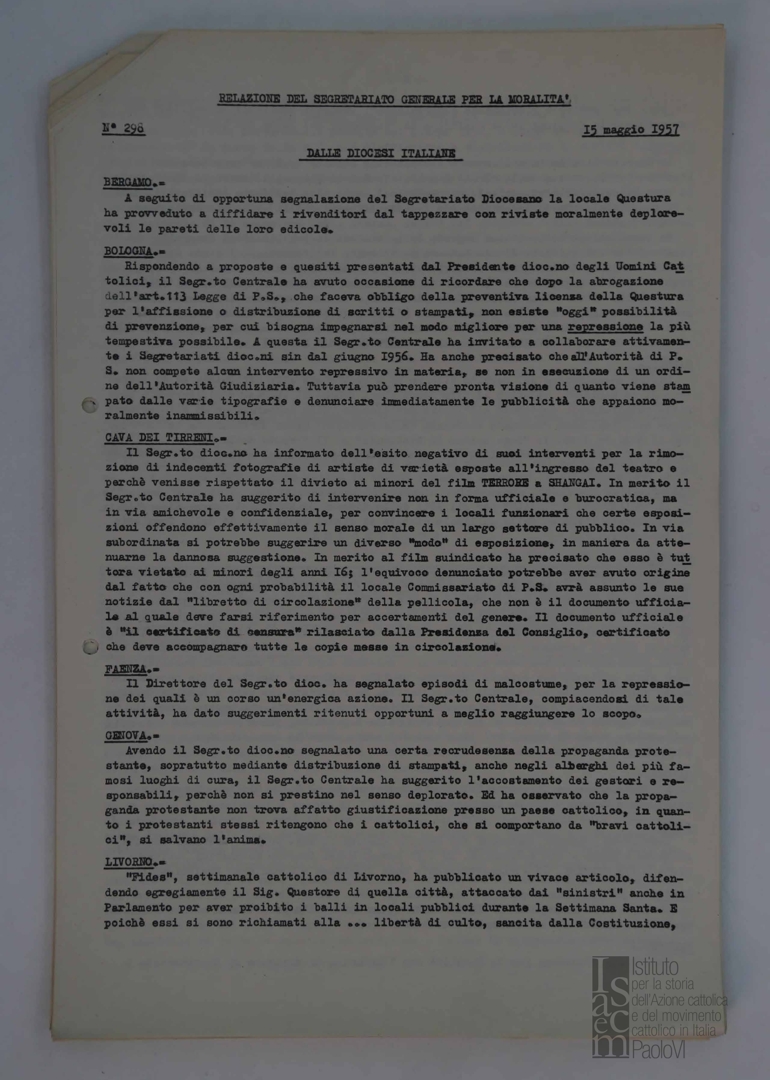 Resoconto delle informazioni sulla pubblica moralità pervenute dalle diocesi italiane e da Roma. Dattiloscritto