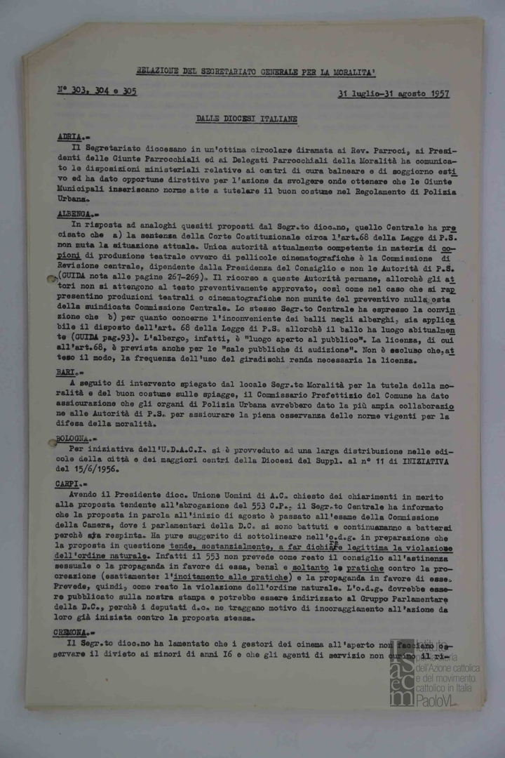 "Relazione del Segretariato Generale per la Moralità. Nn. 303-304-305"