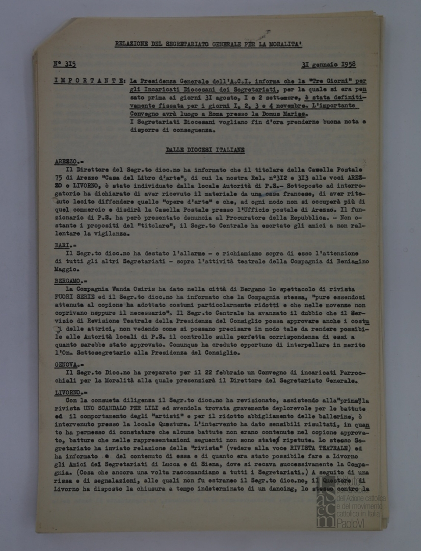 "Relazione del Segretariato Generale per la Moralità. Nr. 315"