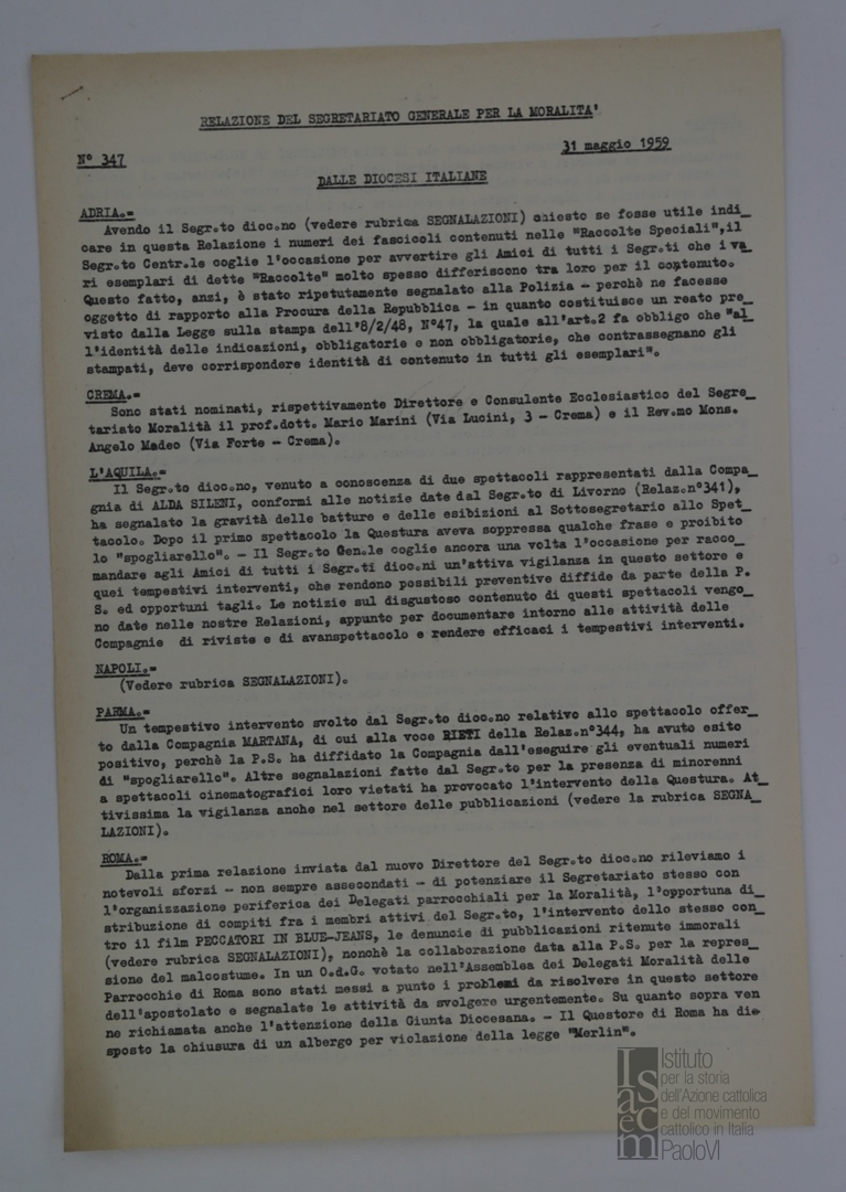 "Relazione del Segretariato Generale per la Moralità. Nr. 347"