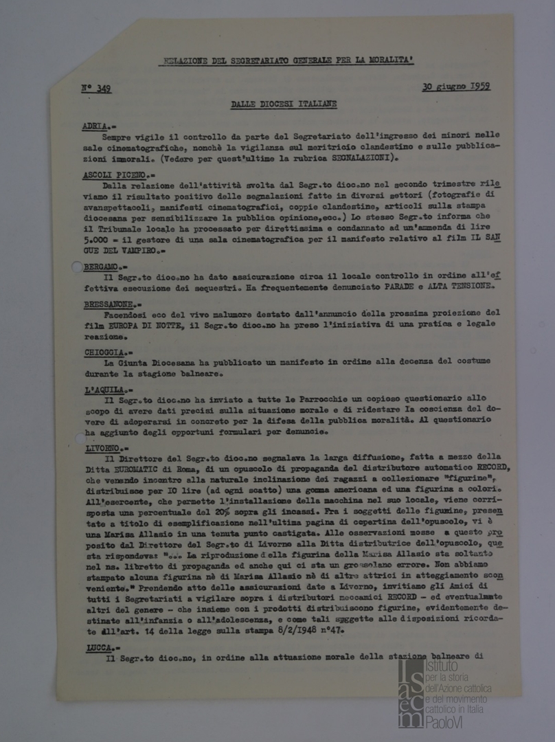 Resoconto delle informazioni sulla pubblica moralità pervenute dalle diocesi italiane e da Roma. Dattiloscritto