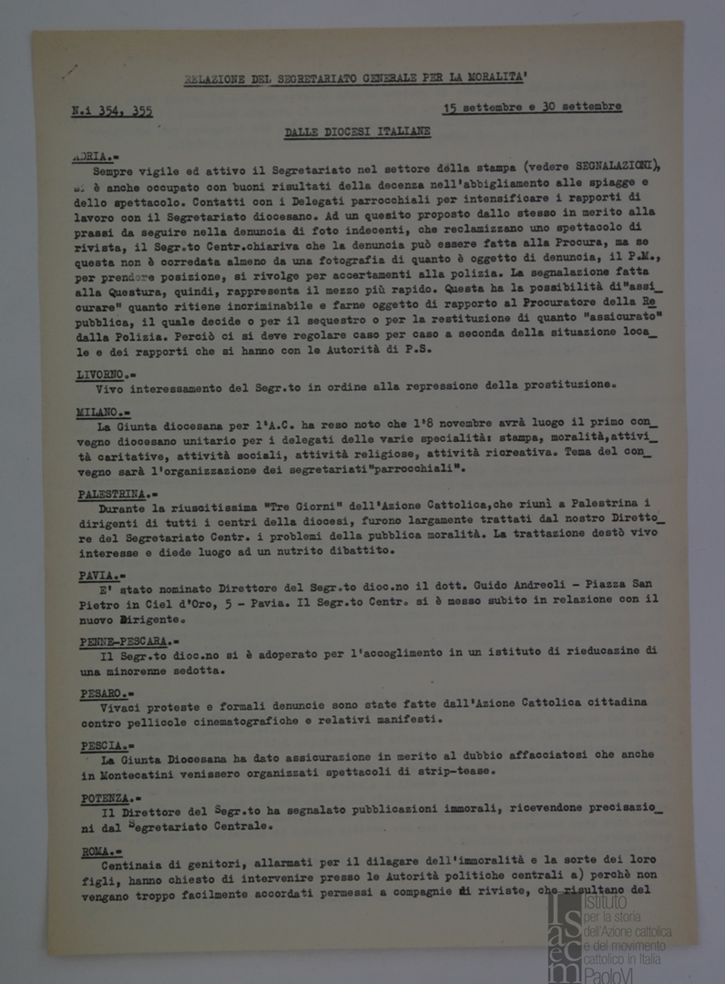Resoconto delle informazioni sulla pubblica moralità pervenute dalle diocesi italiane e da Roma. Dattiloscritto