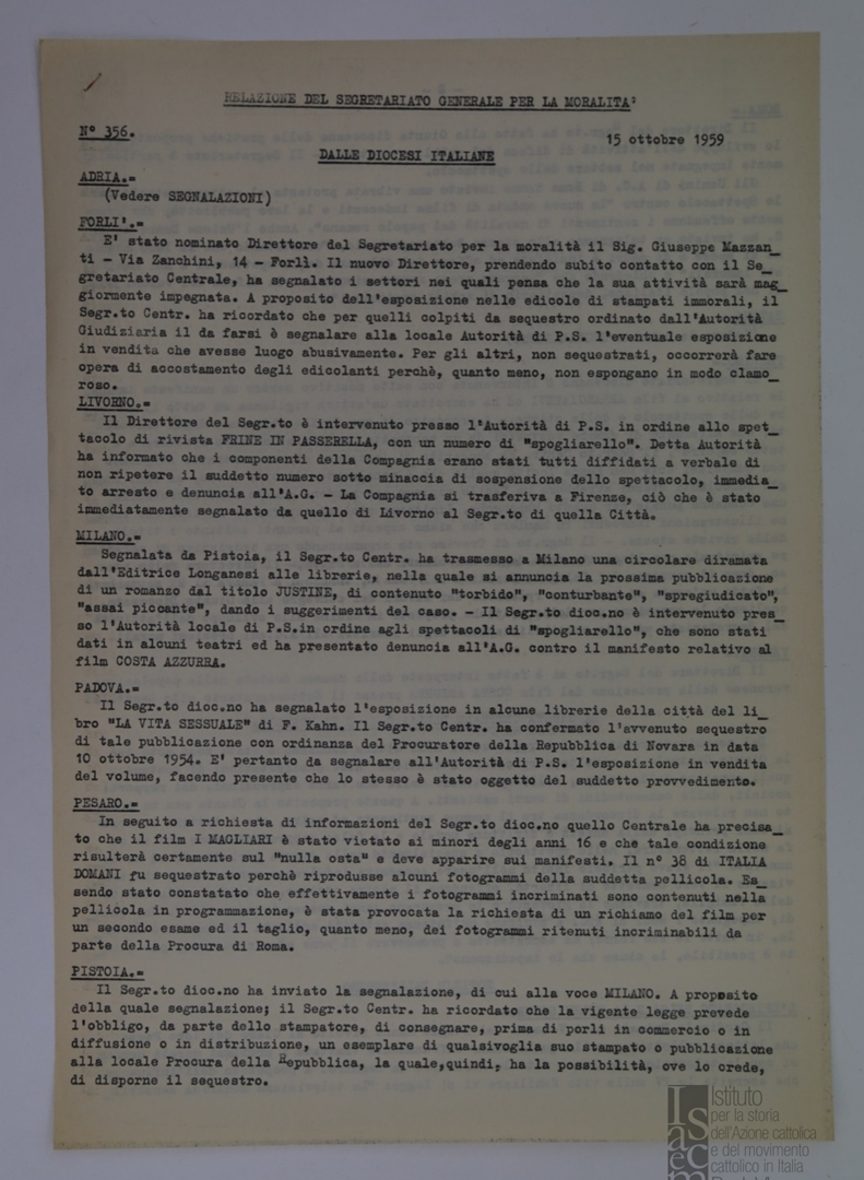 "Relazione del Segretariato Generale per la Moralità. Nr. 356"