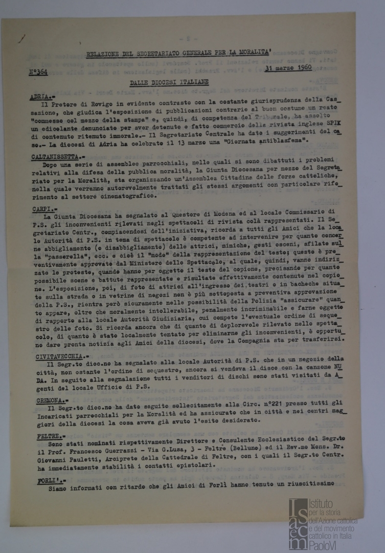 "Relazione del Segretariato Generale per la Moralità. Nr. 364"