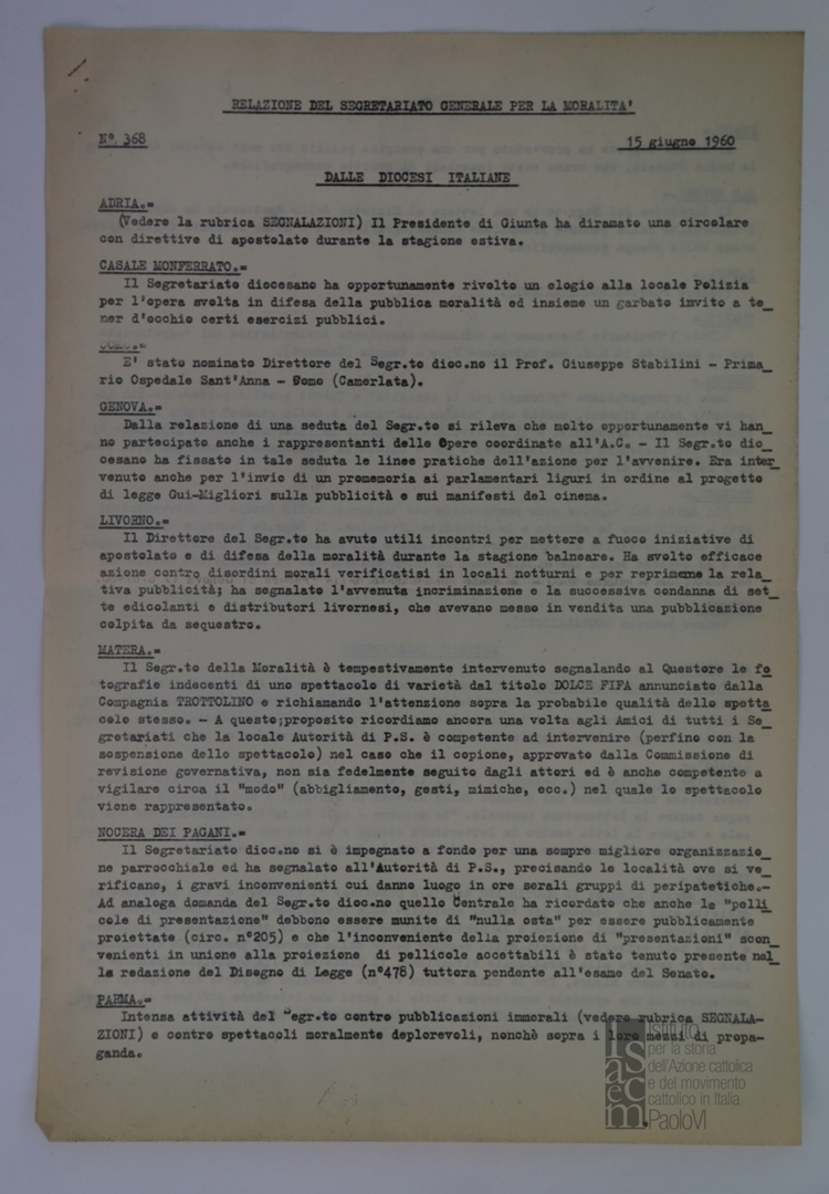 "Relazione del Segretariato Generale per la Moralità. Nr. 368"