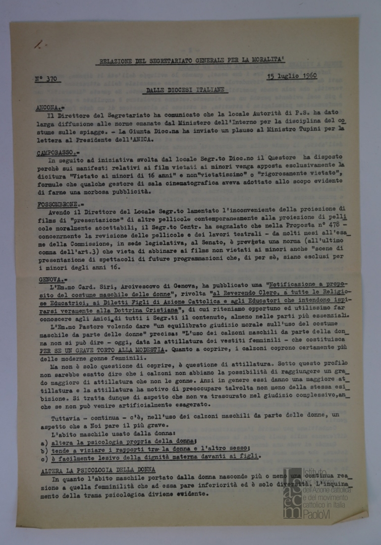 "Relazione del Segretariato Generale per la Moralità. Nr. 370"