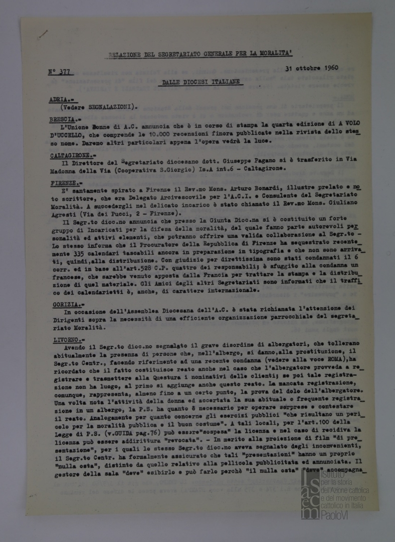"Relazione del Segretariato Generale per la Moralità. Nr. 377"