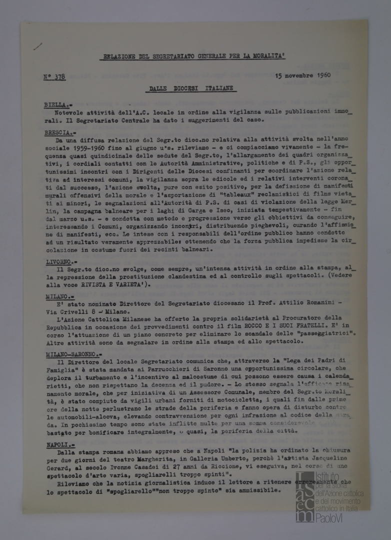 "Relazione del Segretariato Generale per la Moralità. Nr. 378"
