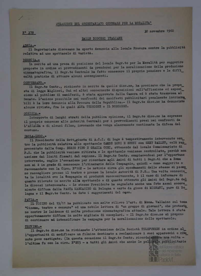 "Relazione del Segretariato Generale per la Moralità. Nr. 379"