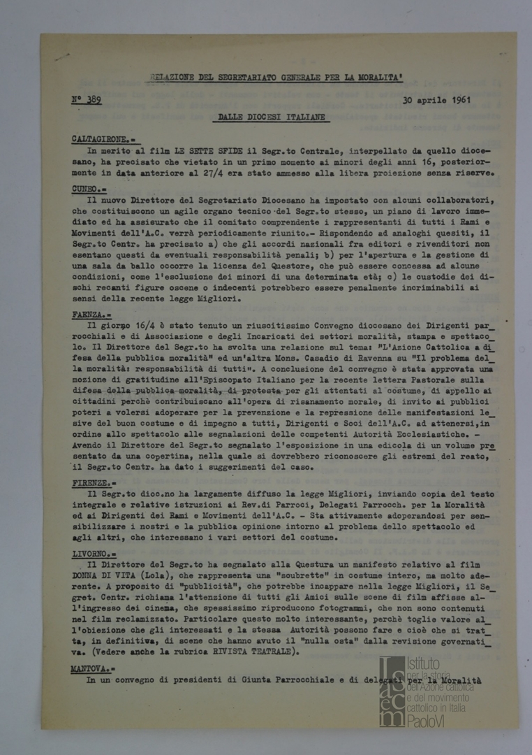 "Relazione del Segretariato Generale per la Moralità. Nr. 389"