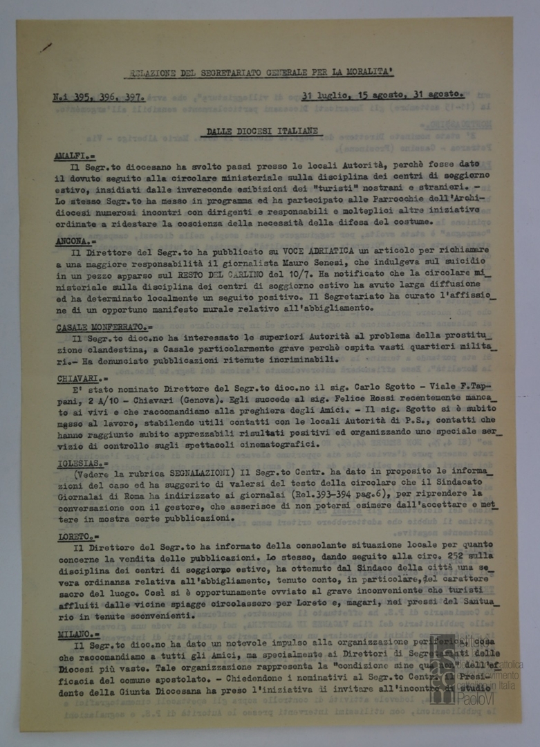 Resoconto delle informazioni sulla pubblica moralità pervenute dalle diocesi italiane e da Roma. Dattiloscritto