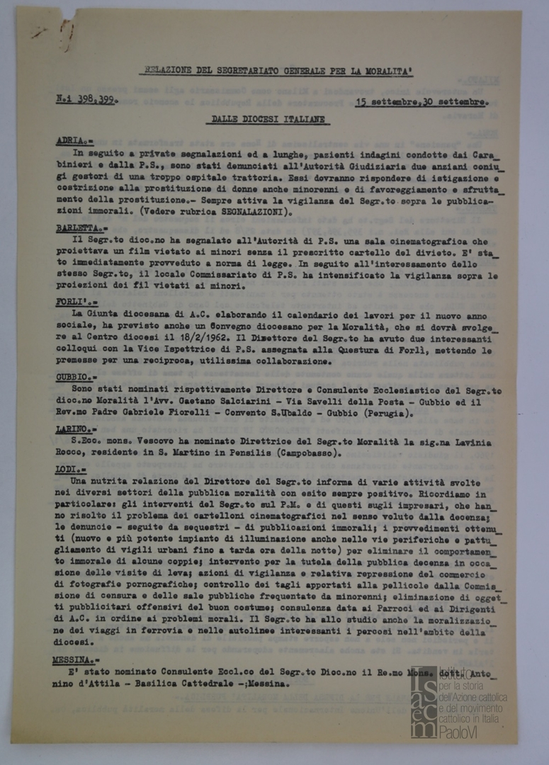 Resoconto delle informazioni sulla pubblica moralità pervenute dalle diocesi italiane e da Roma. Dattiloscritto