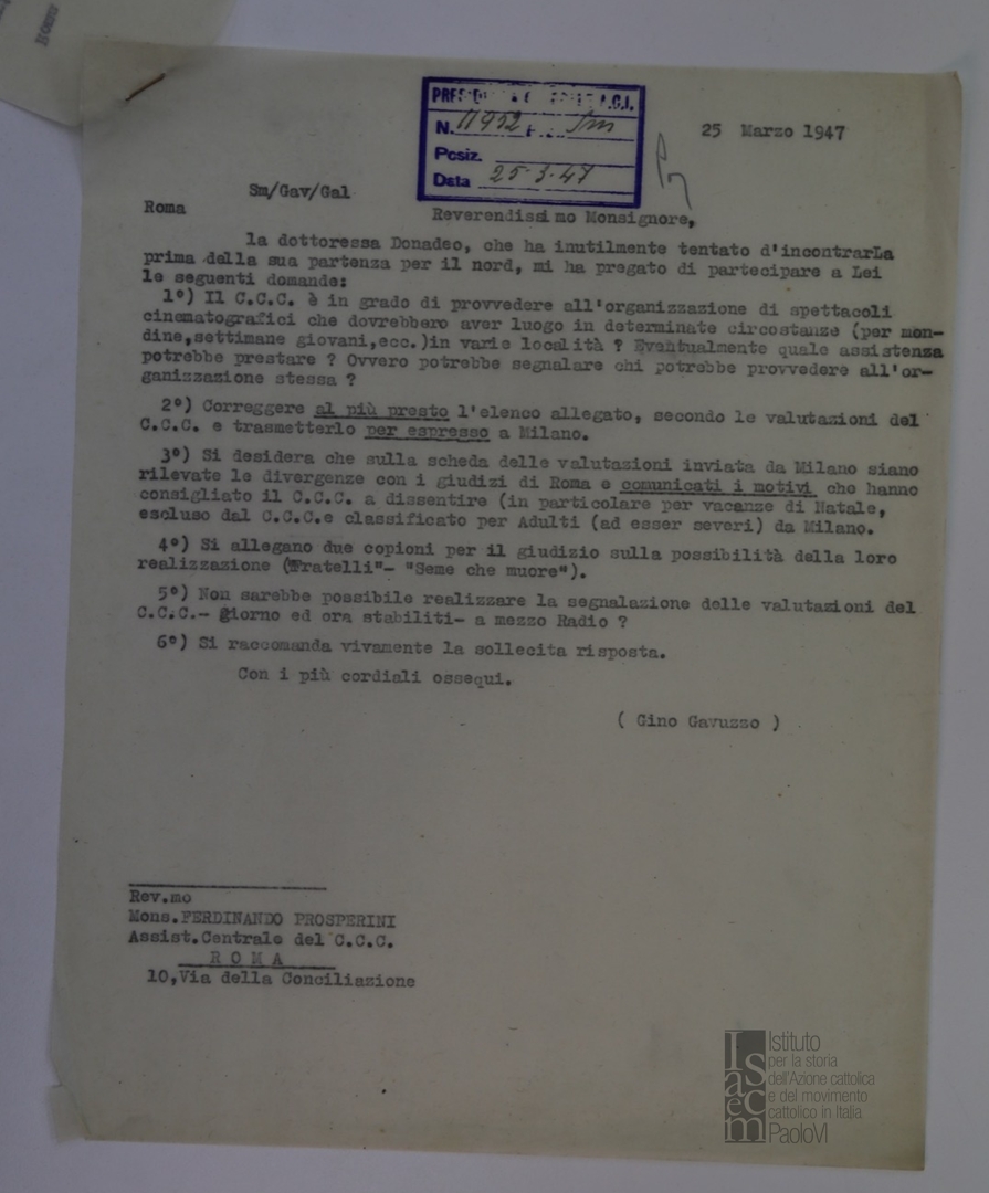 Lettera di Gino Gavuzzo a mons. Ferdinando Prosperini, assistente centrale del Centro cattolico cinematografico - CCC