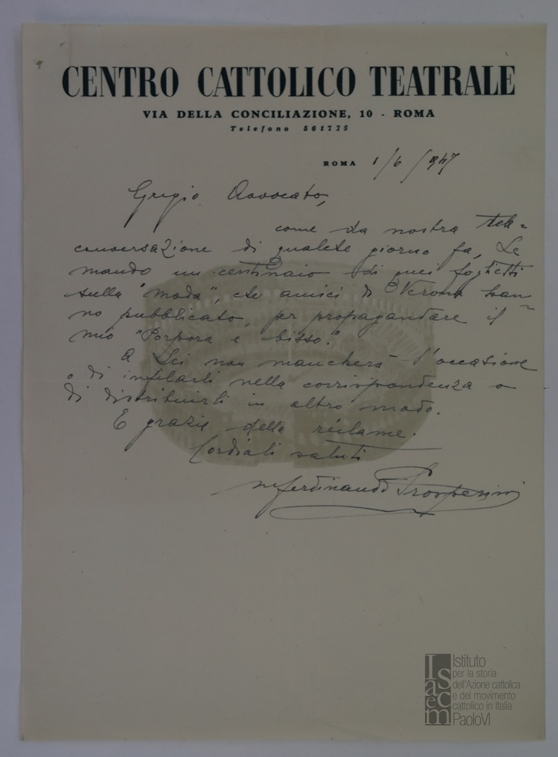 Con lettera di trasmissione di mons. Ferdinando Prosperini a Gino Gavuzzo, nella quale egli chiede di promuovere il suo volume dal titolo "Porpora e bisso". Manoscritto e ritagli di stampa.