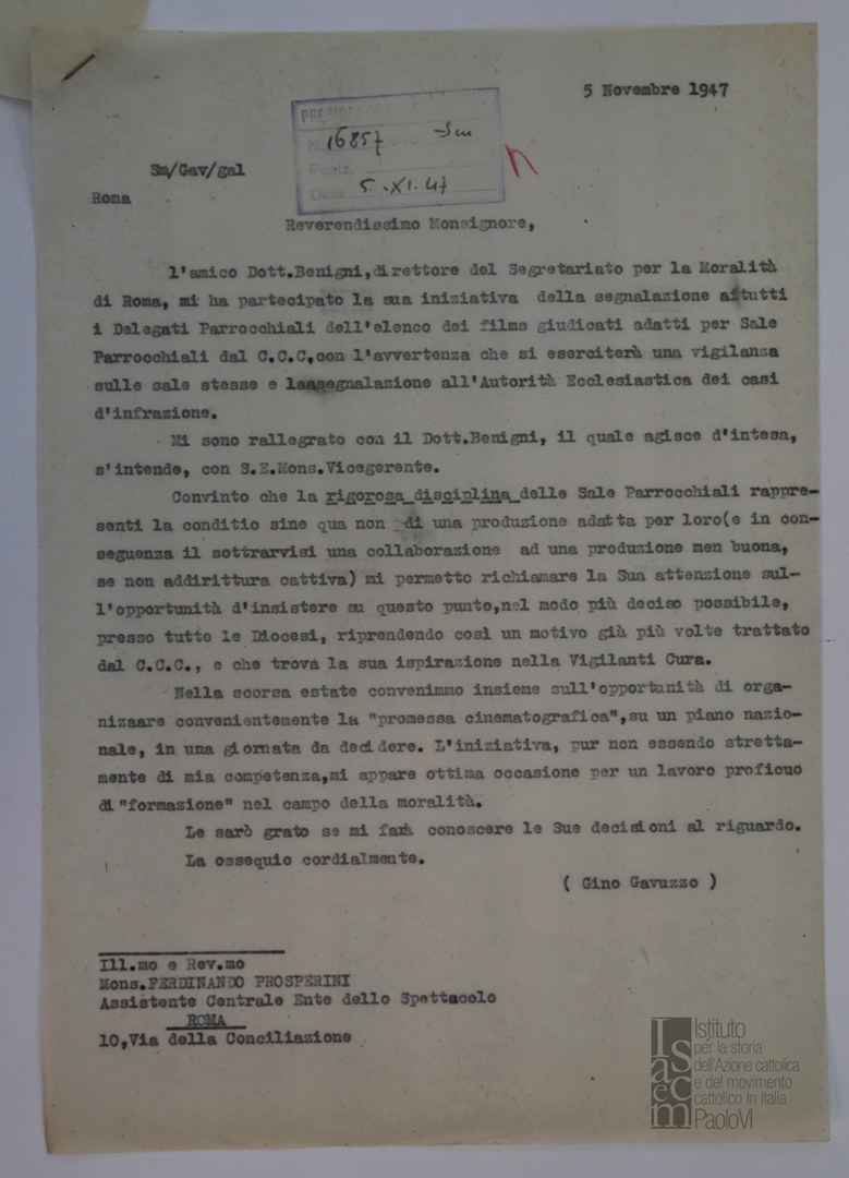 Gino Gavuzzo segnala a mons. Ferdinando Prosperini alcune iniziative volte ad assicurare la disciplina delle sale parrocchiali e la moralità dei film in esse proiettati. Dattiloscritto