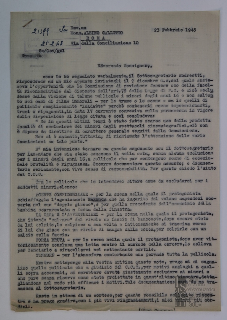 Gino Gavuzzo scrive a mons. Albino Galletto sulla questione della censura cinematografica per i minori di sedici anni. Dattiloscritto