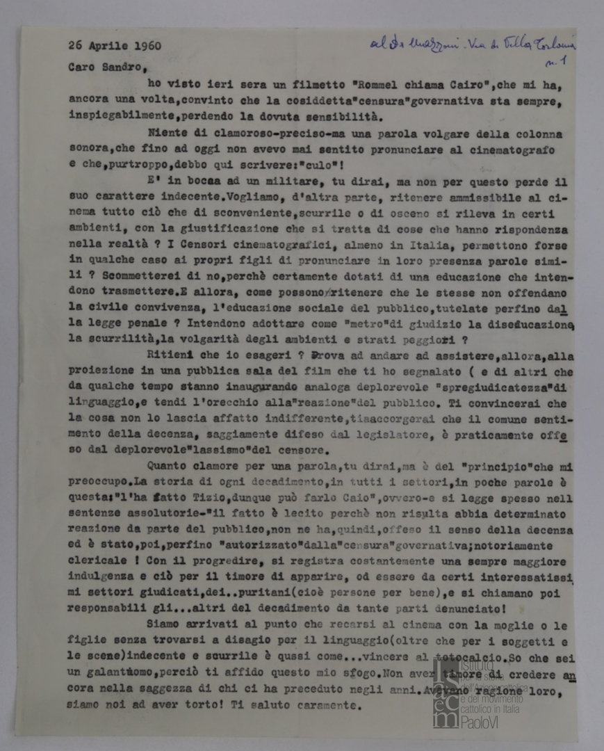 Osservazioni sull'inefficacia della censura cinematografica governativa. Dattiloscritto