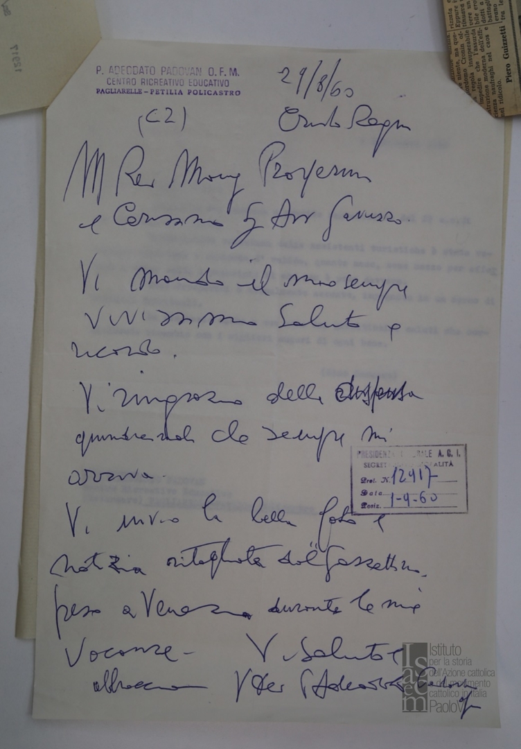 Lettera di padre Adeodato Padovan, del Centro educativo ricreativo di Pagliarelle - Petilia Policastro in provincia di Catanzaro, a Gino Gavuzzo, direttore del Segretariato centrale per la Moralità, e a mons. Ferdinando Prosperini