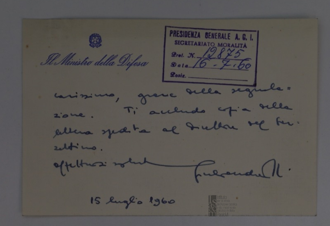 Biglietto di Giulio Andreotti, ministro della difesa, indirizzato a Gino Gavuzzo, direttore del segretariato per la moralità