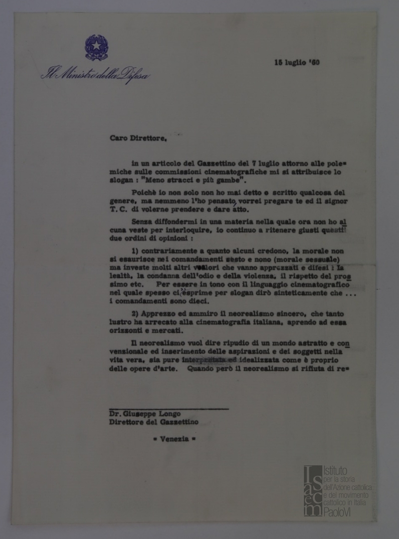 Lettera di Giulio Andreotti, ministro della difesa, a Giuseppe Longo, direttore de Il Gazzettino di Venezia