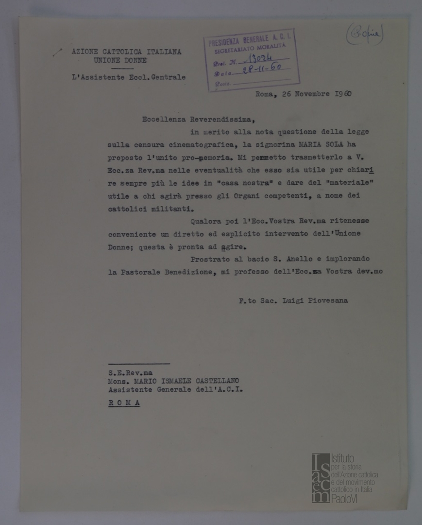 Testo del promemoria. Con lettera di trasmissione di don Luigi Piovesana, assistente ecclesiastico centrale dell'Unione Donne dell'ACI, a mons. Mario Ismaele Castellano, assistente ecclesiastico generale dell'ACI. Dattiloscritto