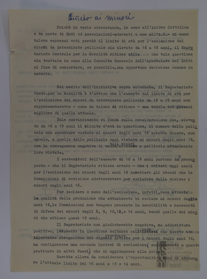 Appunto sulle modalità di revisione del limite di età fissato per il divieto di visione di alcuni film ai minori. Dattiloscritto
