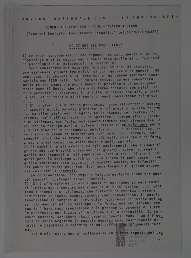 "Convegno nazionale contro la pornografia. Relazione del prof. Fegiz"
