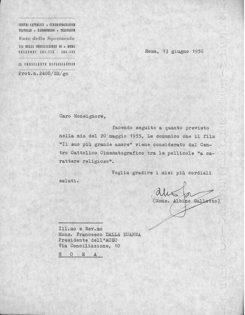 Lettera di mons. Albino Galletto, consulente ecclesiastico dell'Ente dello spettacolo, a mons. Francesco Dalla Zuanna, presidente dell'ACEC