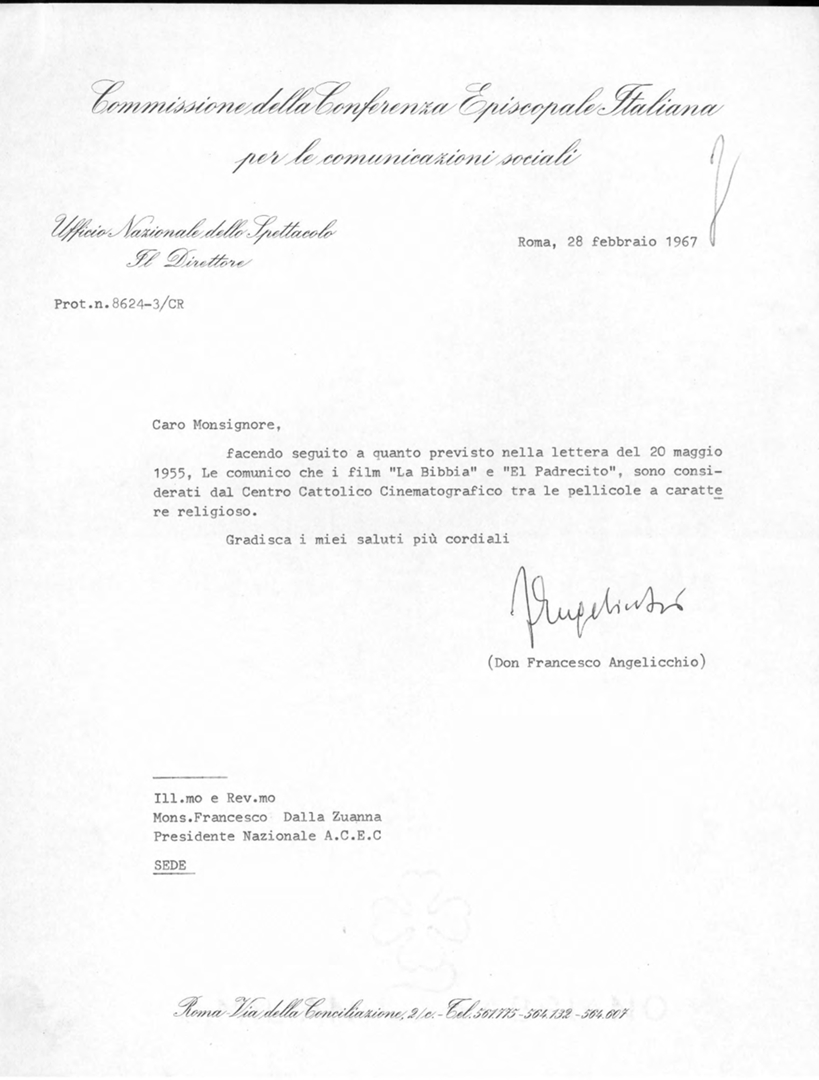 Angelicchio comunica che i film "La Bibbia" e "El Padrecito" sono considerati dal Centro Cattolico Cinematografico tra le pellicole a carattere religioso