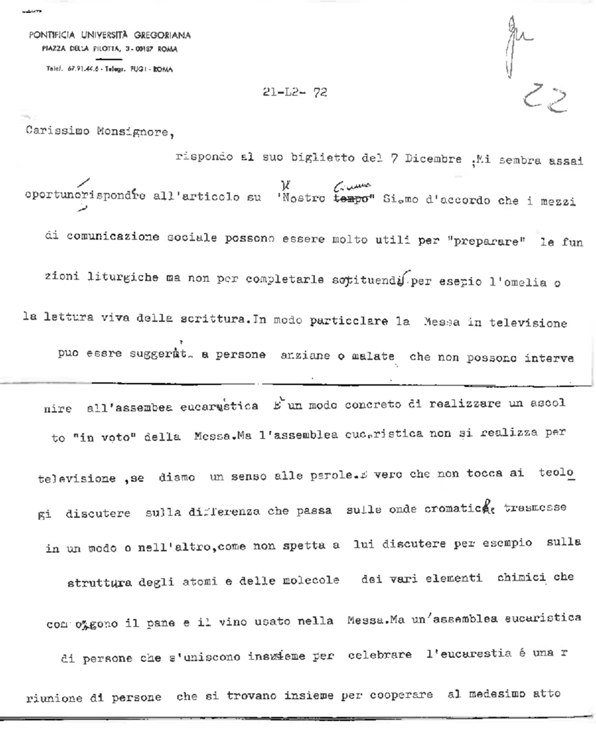Flick scrive in merito al ruolo dei mezzi di comunicazione sociale nella liturgia. Minuta