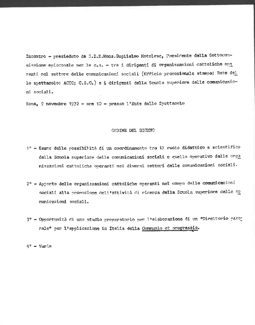 Incontro tra i dirigenti di organizzazioni cattoliche operanti nel settore delle comunicazioni sociali e i dirigenti della Scuola Superiore delle comunicazioni sociali tenutosi presso l'Ente dello Spettacolo. Presiede l'incontro mons. Guglielmo Motolese, presidente della Sottocommissione episcopale per le comunicazioni sociali. Ordine del giorno dattiloscritto e minuta manoscritta del verbale della riunione