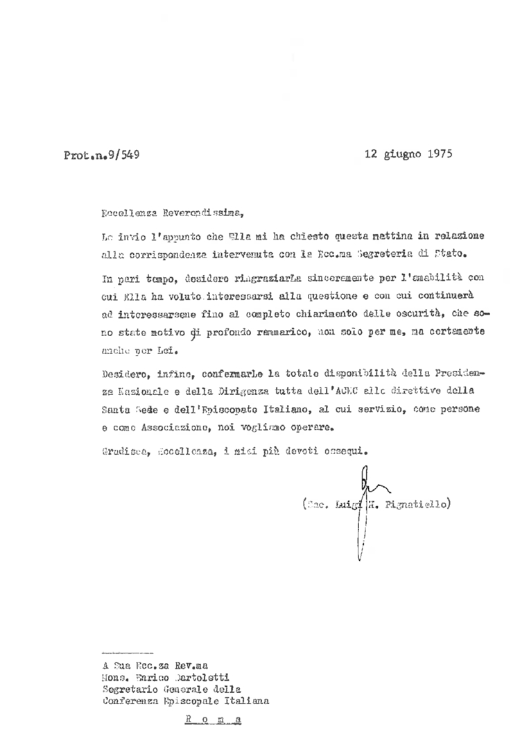 Lettera di Luigi Pignatiello, delegato diocesano e regionale dell'ACEC a mons. Enrico Bartoletti, segretario generale della Conferenza Episcopale Italiana