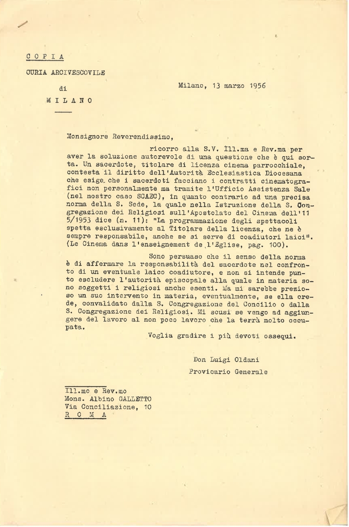Lettera di don Luigi Oldani, provicario generale della Curia arcivescovile di Milano, a mons. Albino Galletto, consulente ecclesiastico dell'Ente dello Spettacolo