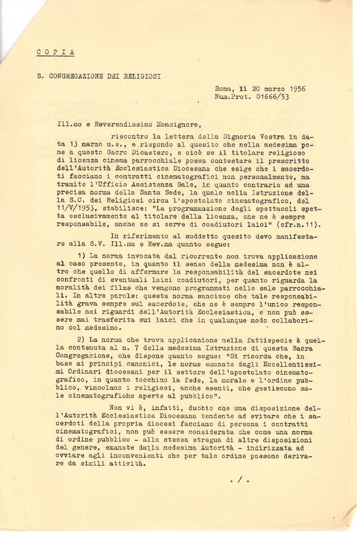 Valeri scrive in merito ad una questione relativa alle licenze dei cinema parrocchiali