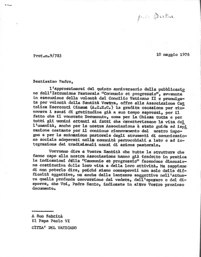 Lettera di Luigi Pignatiello, presidente nazionale dell'ACEC, a Sua santità Papa Paolo VI