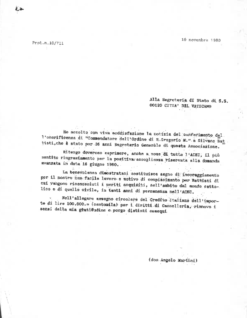 Don Angelo Martini dell'A.C.E.C scrive alla Segreteria di Stato della Santa Sede per ringraziare della consegna a Silvano Battisti dell'onorificenza di "Commendatore con placca dell'Ordine di S. Gregorio Magno". Dattiloscritto