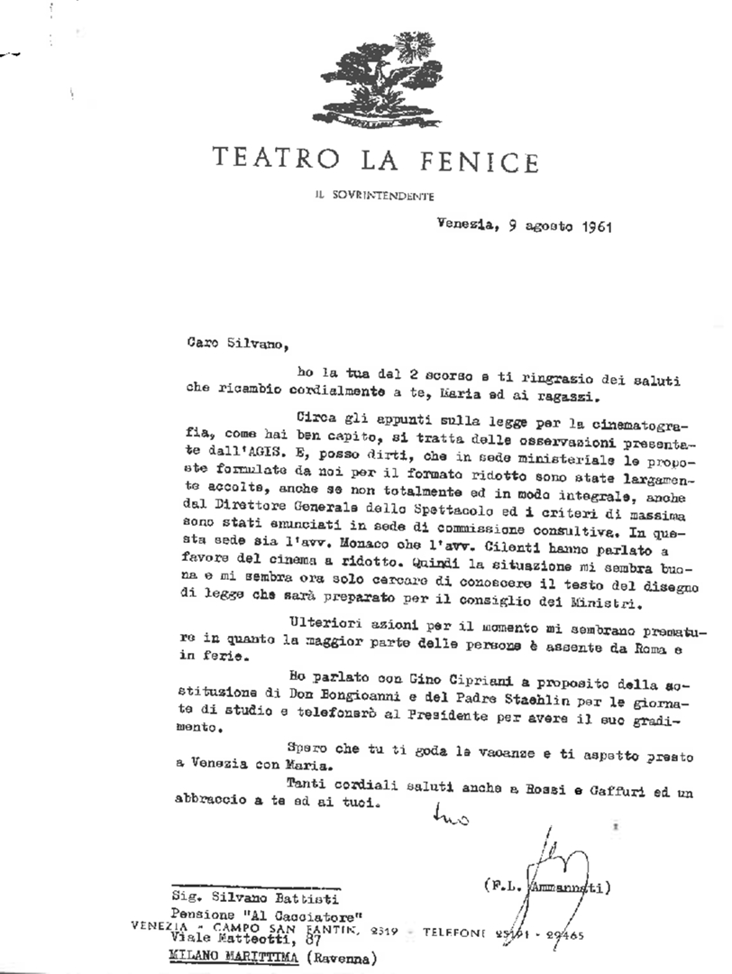 Floris Ammannati, Sovrintendente del Teatro La Fenice, scrive a Silvano Battisti sulla legge per la cinematografia. Dattiloscritto