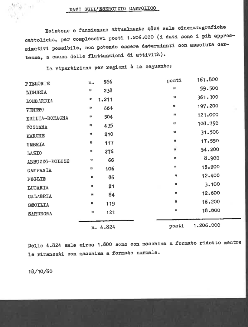 Sale cinematografiche cattoliche e vescovi formalmente delegati dalle rispettive conferenze episcopali a seguire i problemi dello spettacolo. Elenchi dattiloscritti.