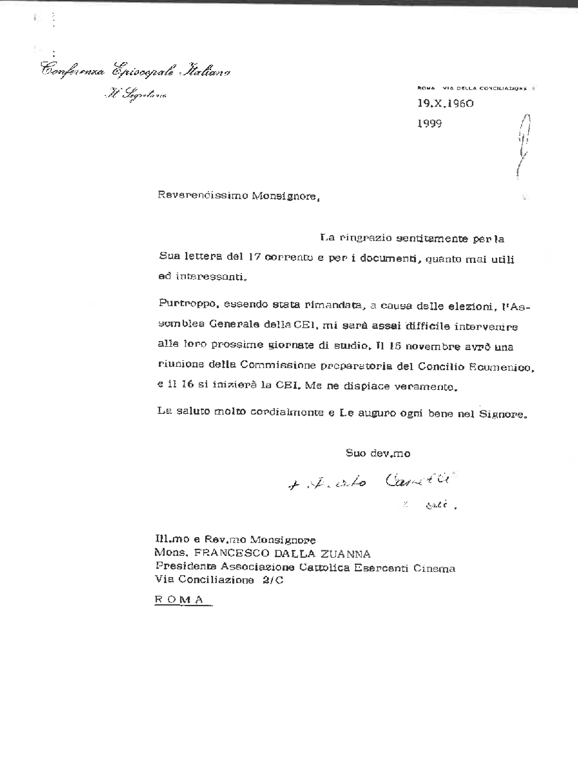 Lettera di Alberto Castelli , segretario della CEI, a mons. Francesco Dalla Zuanna, presidente dell'ACEC