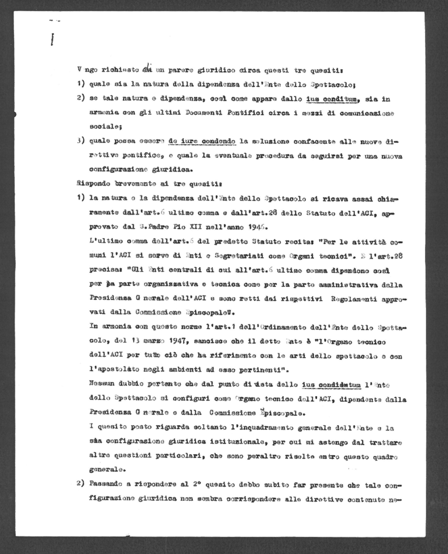 Parere giuridico di Salvatore Canals, esperto in pastorale cinematografica, sulla natura e la dipendenza dell'Ente dello Spettacolo e sulle direttive concernenti il settore dei mezzi di comunicazione sociale. Dattiloscritto, con firma autografa.