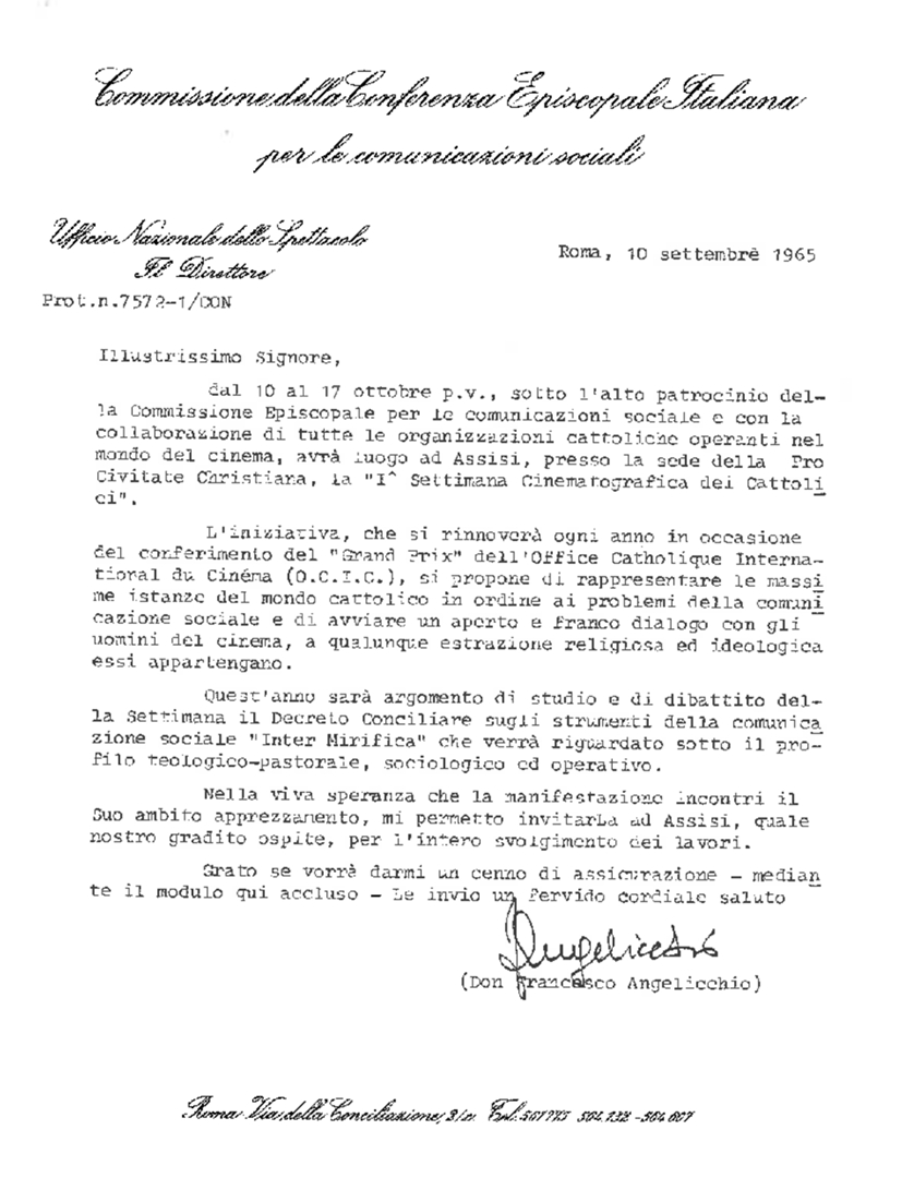 Lettera di don Francesco Angelicchio, direttore dell'Ufficio Nazionale dello Spettacolo della Commissione della Conferenza Episcopale Italiana per le comunicazioni sociali, a destinatario non indicato