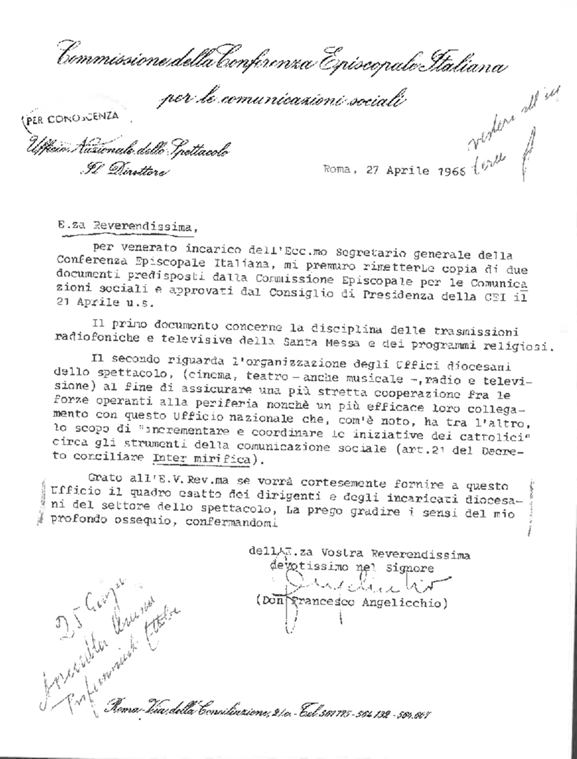 Lettera di don Francesco Angelicchio, direttore dell'Ufficio Nazionale dello Spettacolo della Commissione della Conferenza Episcopale Italiana per le comunicazioni sociali, a destinatario non indicato