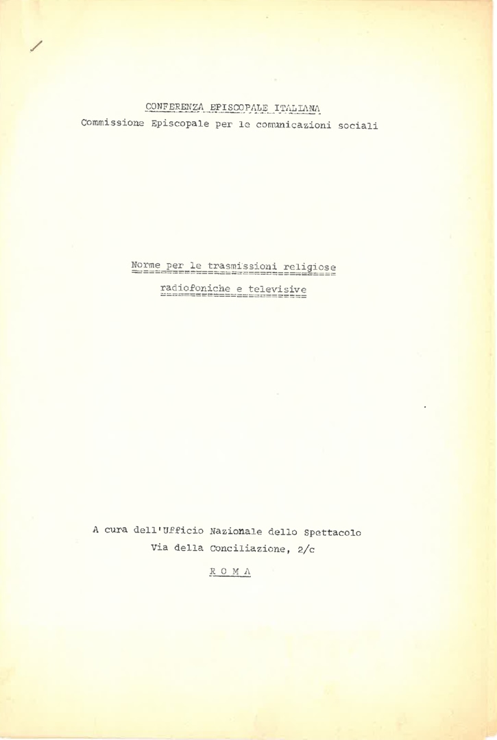 "Norme per le trasmissioni religiose radiofoniche e televisive" a cura dell'Ufficio nazionale per lo Spettacolo della Commissione della Conferenza Episcopale Italiana per le comunicazioni sociali. Testo dattiloscritto