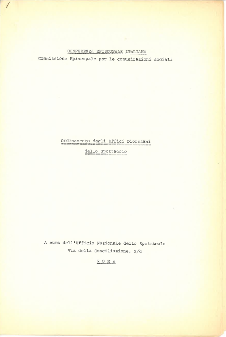 "Ordinamento degli Uffici Diocesani dello Spettacolo" a cura dell'Ufficio nazionale per lo Spettacolo della Commissione della Conferenza Episcopale Italiana per le comunicazioni sociali. Testo dattiloscritto